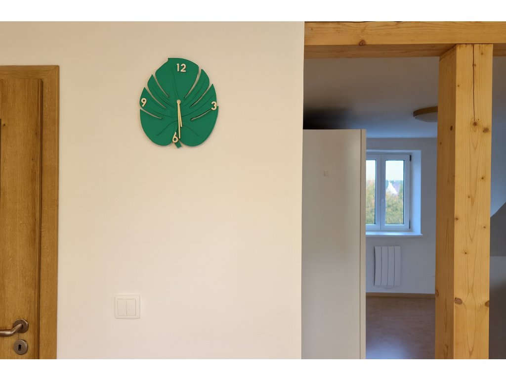 Hodiny inspirované listem monstery, které působí svěže a přirozeně. Zelená barva oživí stěnu a připomene zeleň pokojových rostlin – skvěle ladí s moderním i přírodním interiérem. Tichý strojek neruší, takže se hodí i do ložnice nebo pracovny.